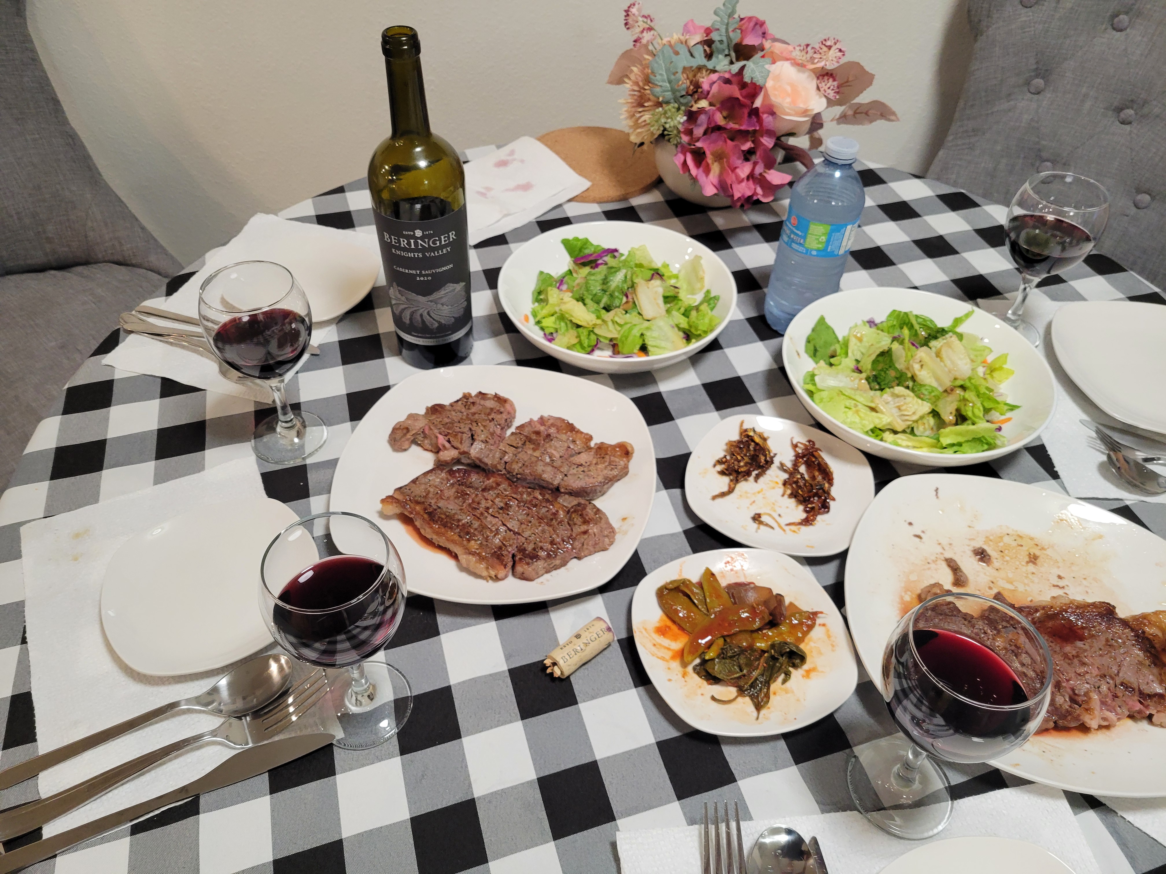 레드와인을 곁들인 스테이크로 저녁을 먹으며